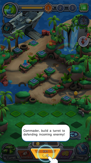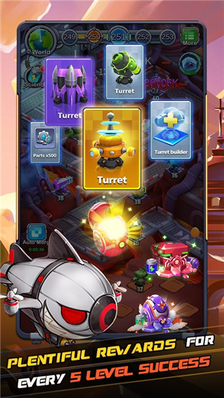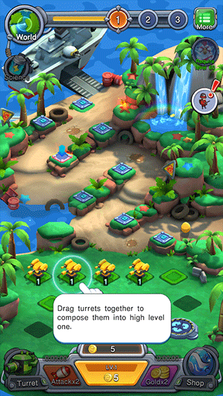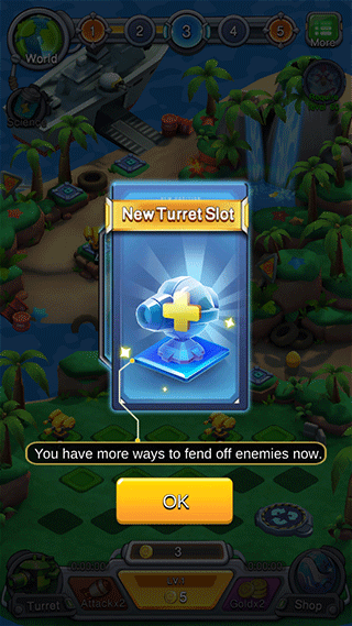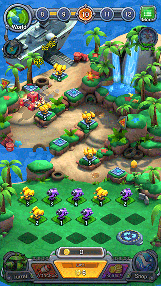 2、每个炮塔有等级之分,相同等级的炮塔可以合成在一起,升级更高一级的炮塔,等级越高伤害越高。