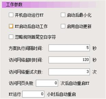 ②、ET启动后自动工作:ET启动运行后,自动执行上一次使用ET时勾选的工作方案,只有启用本项,才会自动保存当前勾选的工作方案;