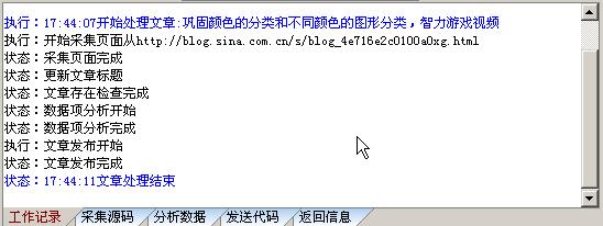 该栏记录ET的每一步工作过程及状态,包括目录采集和文章处理两大部分,我们通过工作记录可以了解该次采集执行是否正确完成,或是出现了什么问题;当出现问题时,可以根据提示、结合信息栏的其他反馈内容,用户可以迅速准确地找到故障原因并予解决。