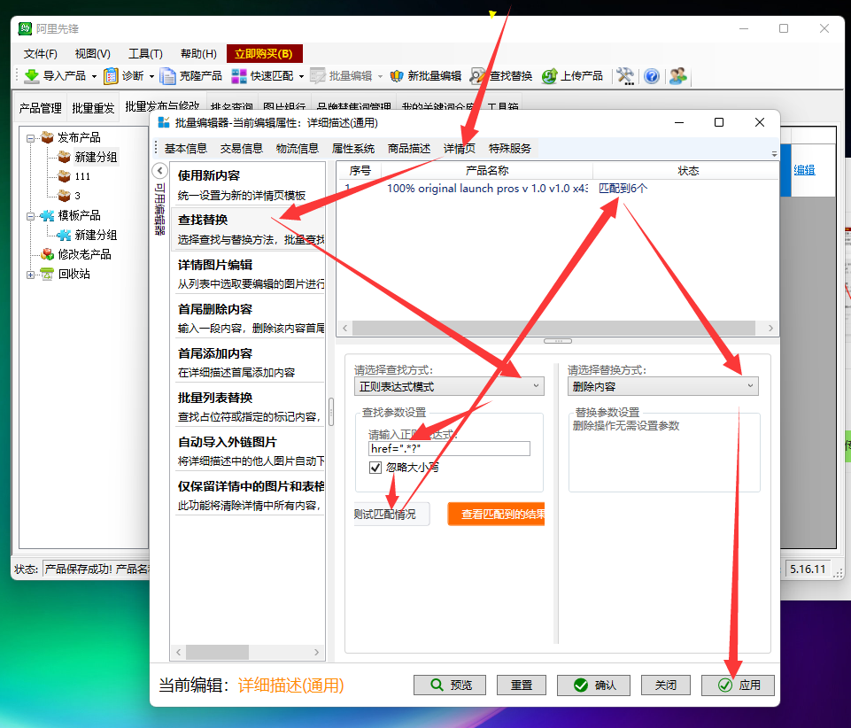 首先右键全选要编辑的产品,再点上面的:新批量编辑--详情页--详情描述通用--查找替换--正则表达式模式--输入 href=".*?"再测试匹配情况--删除内容,最后点击应用即可。