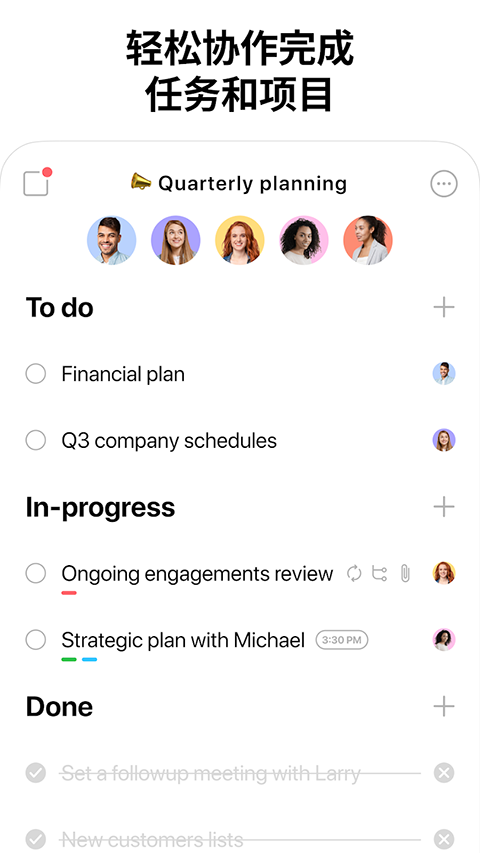 在清单和项目中计划您所有的待办事项。用颜色标记它们以设置优先级和类别。通过笔记、子任务和附件来提高您的工作效率。用共享列表和分配任务完成更多工作。