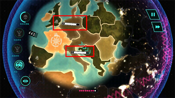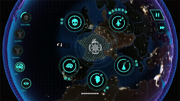 4、放大视图,点击地球上的其余势力,玩家可以选择直接攻击、研究、扩张拆除以及建造导弹等操作;