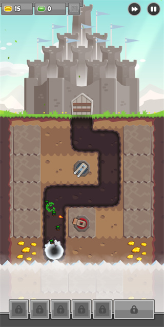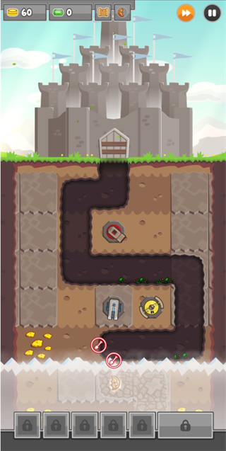 挖掘防卫者(Digfender)是一款经典的塔防策略手游,游戏围绕着一个未知而邪恶的土地有着突然上升的趋势,导致地面上一座岌岌可危的城堡,为了阻止这种趋势,你走了挖冰床,把敌人消灭在地下的道路。其玩法上类似于保卫萝卜,看似简单你也不能有丝毫的松懈,挖掘防卫者游戏与传统的塔防相比,还加入了搜集资源的玩法,你需要一边与各种来自地底的怪物展开战斗,一边挖掘搜集资源。